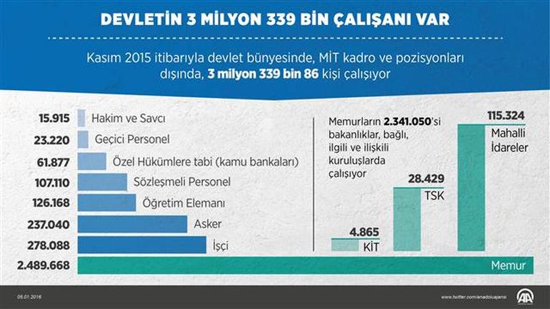 AA muhabirinin, Devlet Personel Başkanlığı verilerinden derlediği bilgilere göre, Kasım 2015 itibarıyla devlet bünyesinde, Milli İstihbarat Teşkilatı kadro ve pozisyonları dışında, 3 milyon 339 bin 86 kişi çalışıyor. Bunlardan 2 milyon 489 bin 668'i memur, 15 bin 915'i hakim ve savcı, 126 bin 168'i öğretim elemanı, 107 bin 110'u sözleşmeli personel, 278 bin 88'i işçi, 23 bin 220'si geçici personel, 237 bin 40'ı asker ve 61 bin 877'si özel hükümlere tabi (kamu bankaları) personelden oluşuyor.